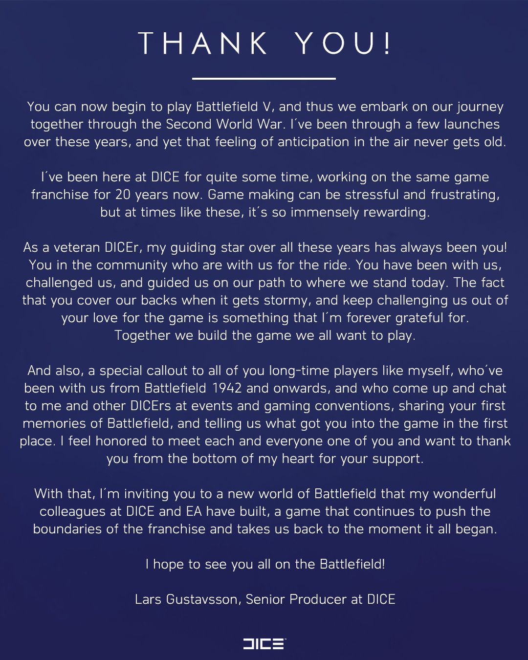 " Le temps passe vite quand vous êtes en compagnie de bons amis. Il est temps pour moi de me retirer et de rentrer chez moi pour nourrir les enfants mais je veux vous quitter avec cette lettre. Merci beaucoup pour ce que ce que vous avez fait jusqu'à ce jour. J'espère que vous que vous l'appréciez autant que j'ai l'ai fait. Au plaisir de vous voir sur Battlefield"