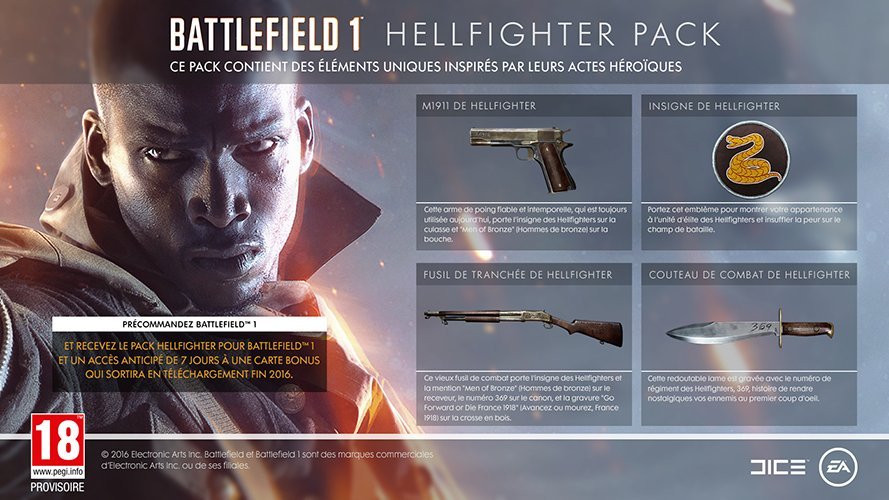 L’édition standard de Battlefield 1 contient le jeu de base (jusque-là rien d’étonnant me direz-vous) Néanmoins, si vous précommandez cette édition avant le 21 octobre 2016, vous obtiendrez le Hellfighter Pack contenant plusieurs éléments à l’effigie des « Harlem Hellfighters » connu pour être le plus important régiment de Noirs actif durant la 1ère Guerre Mondiale. Vous retrouverez dans ce pack un M1911 de Hellfighter, un Insigne de Hellfighter, un Fusil de tranchée de Hellfighter et enfin le couteau de combat de Hellfighter. Vous aurez également un accès anticipé de 7 jours à une nouvelle carte qui sera dévoilée d’ici à là fin de l’année 2016.