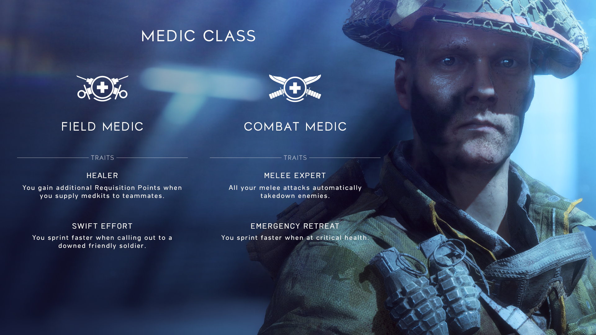 Sur le terrain, la classe Medic aide à la survie de l’escouade. Ils permettent de garder l’escouade dans le feu de l’action le plus longtemps possible à l’aide d’une réanimation plus rapide que la réanimation « Non-Medic » et de sacoches de soin.